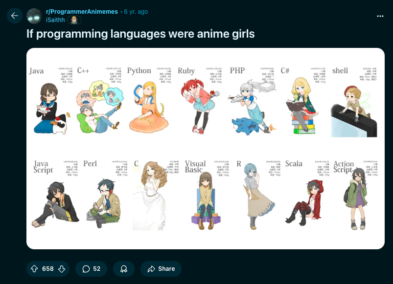 I don’t really know a lot about the other well-known languages, like ruby, rust, etc.. so I can’t really picture them as cute anime girls. I’ll be coming back to this post once in a while if I get to learn more about other languages.